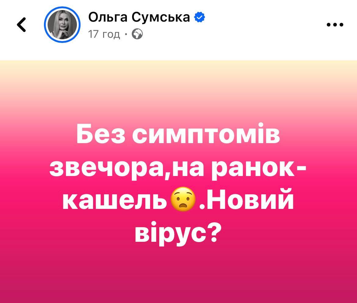 "Без симптомів звечора, а на ранок - кашель. Новий вірус? Друзі, напишіть рекомендації, бо на рівному місці просто", - зазначила Сумська.