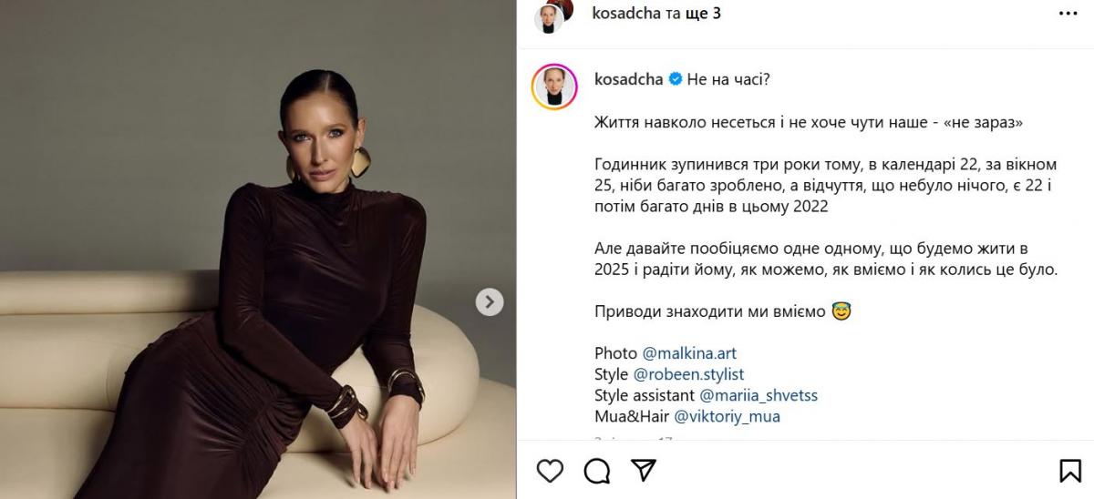 "Годинник зупинився три роки тому, в календарі 22, за вікном 25, ніби багато зроблено, а відчуття, що небуло нічого, є 22 і потім багато днів в цьому 2022... Але давайте пообіцяємо одне одному, що будемо жити в 2025 і радіти йому, як можемо, як вміємо і як колись це було", - написала вона.