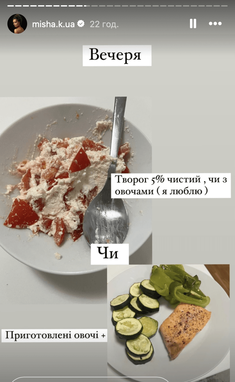 "В мене були три основні варіанти сніданку, хоча зараз так само. Вівсяна крупа, білок, авокадо боул з тунцем у власному соку (овочі, темний рис). Вівсяна крупа, 100 г фруктів, 50 г горіхів (усі, окрім фісташок та арахісу). І ось я міксувала по днях. Ніяких заправок, соусів, тільки олії, крім соняшникової", – вказала Мішина.