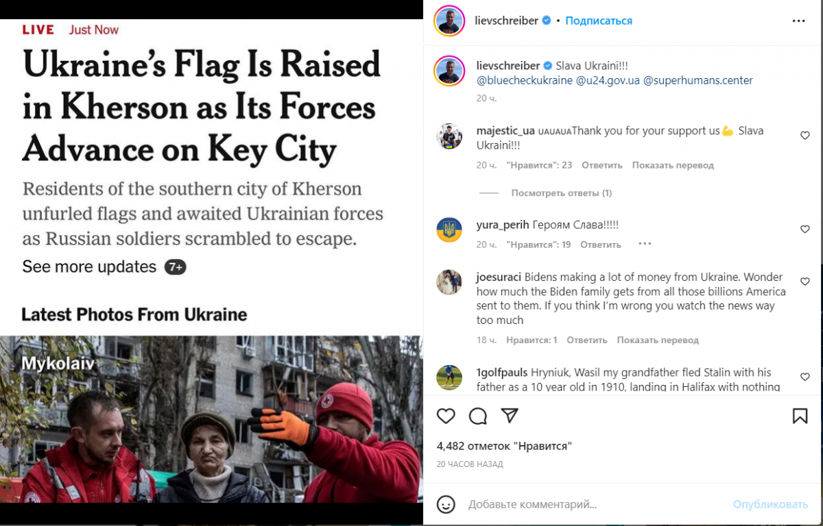 Зірка "Людей Ікс" Лієв Шрайбер відреагував на звільнення Херсона від російських окупантів. Голлівудський актор у своєму Instagram-блозі опублікував скріншот статті одного з міжнародних видань про підняття українського прапора в цьому місті і написав: "Слава Україні!".
