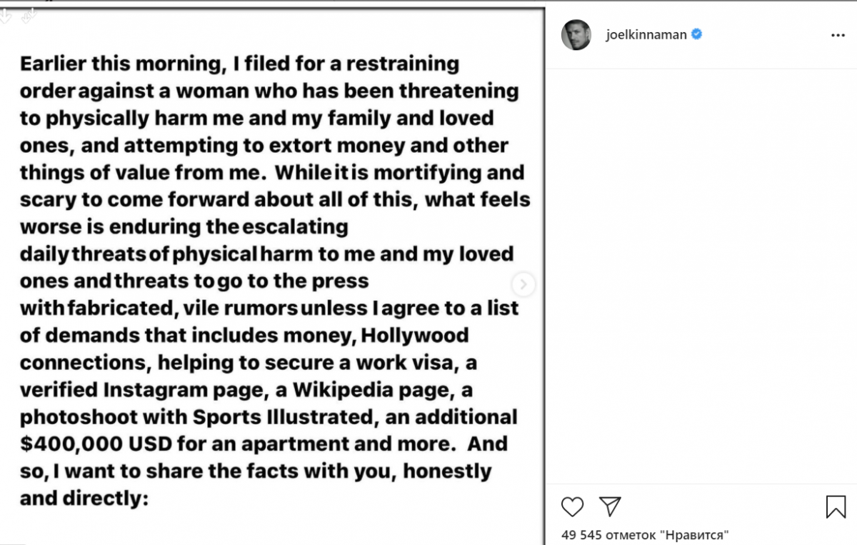 Все почалося з того, що пара перебувала в романтичних відносинах. Однак разом вони були недовго. Після розриву модель почала шантажувати і погрожувати акторові і просити, щоб він познайомив її з "потрібними" людьми Голлівуду. Також за словами Кіннаман, дівчина вимагала у нього грошей.