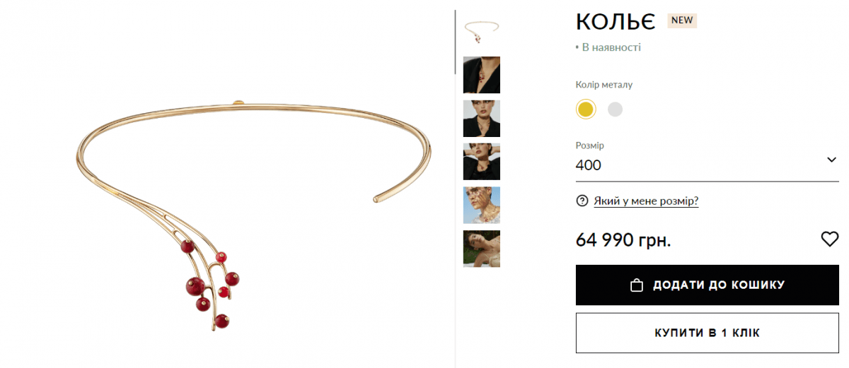 Але головною "родзинкою" образу Зеленської стало кольє з гілками калини від бренду SOVA. На офіційному сайті бренду зазначено, що дане кольє з жовтого золота зі вставками з коралів коштує майже 65 тисяч гривень.
