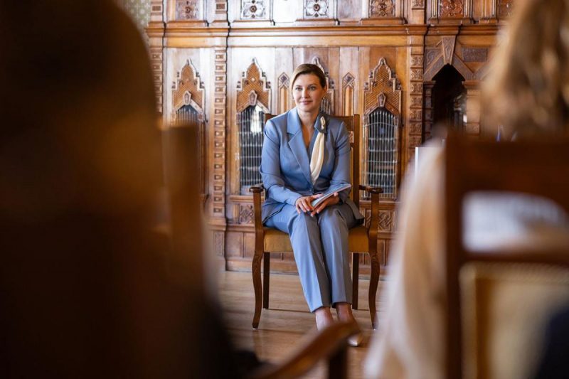 Для важливої події дружина глави держави обрала діловий, але водночас вишуканий та стильний образ. Вона приміряла блакитний костюм, який складався з приталеного жакета і прямих штанів зі стрілками.