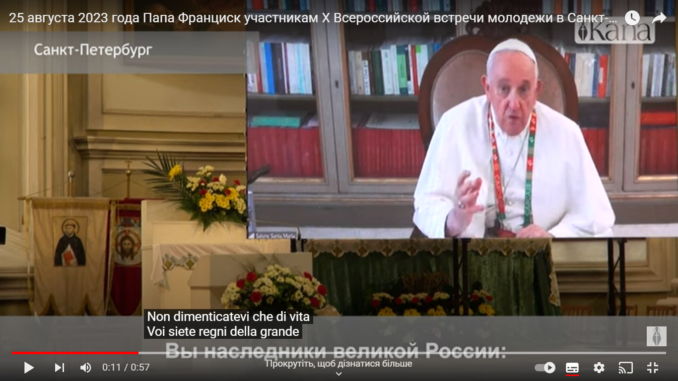 А це – скріншот зі звернення Папи Римського Франциска на онлайн-зустрічі з католицькою молоддю Санкт-Петербурга 25 серпня 2023 року.