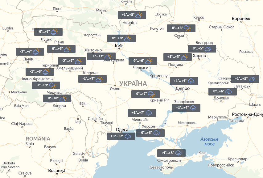 Погода в Україні на сьогодні. На сході практично без опадів, температура вночі до 0°, вдень до +6°. Жителів південних регіонів очікують дощі. Вночі температура до 0°, вдень до +8°.