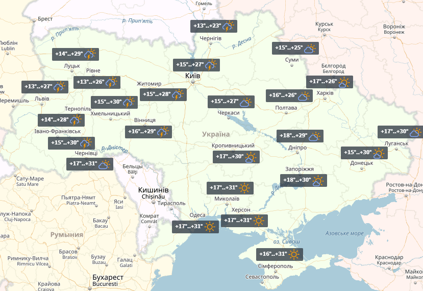 У столиці в суботу без опадів, температура повітря вночі +15°, вдень +25°. У неділю гроза, +15° ... +27°.