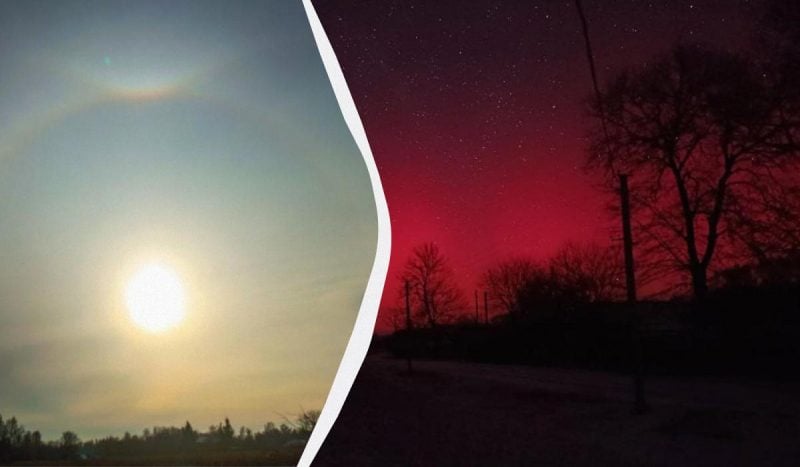 Зокрема, вночі над Сумщиною можна було побачити полярне сяйво, яке зафарбувало небо у червоний колір. А вже в вдень на небосхилі з'явилося рідкісне подвійне гало.