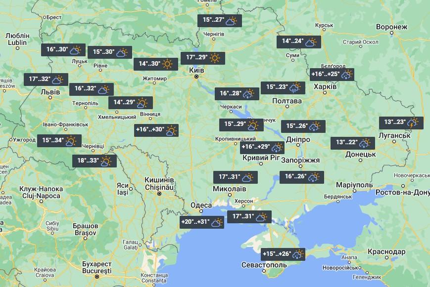 У Харкові в суботу температура вночі складе +16°, вдень +25°, невелика хмарність, легкий дощ. У неділю стовпчики термометрів покажуть +16°...+28°, практично безхмарно.