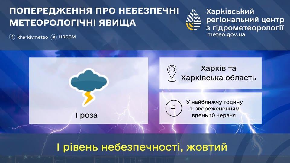 У Харкові сьогодні, 10 червня, буде гроза. Попередження про небезпечні метеорологічні явища оприлюднив Харківський регіональний центр з гідрометеорології.