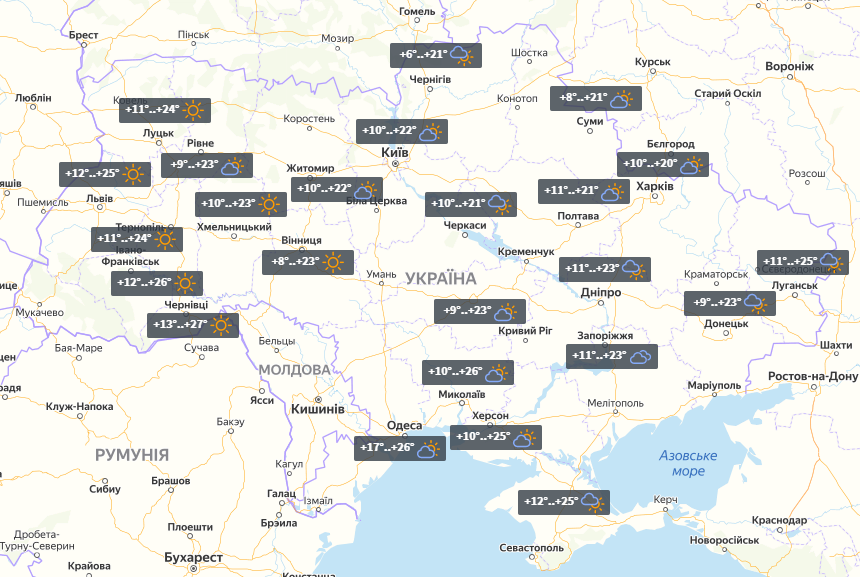 У північних областях хмарно з проясненнями. Температура вночі до +6°, вдень до +22°. У центрі без опадів, температура вночі до +8°, вдень до +23°.
