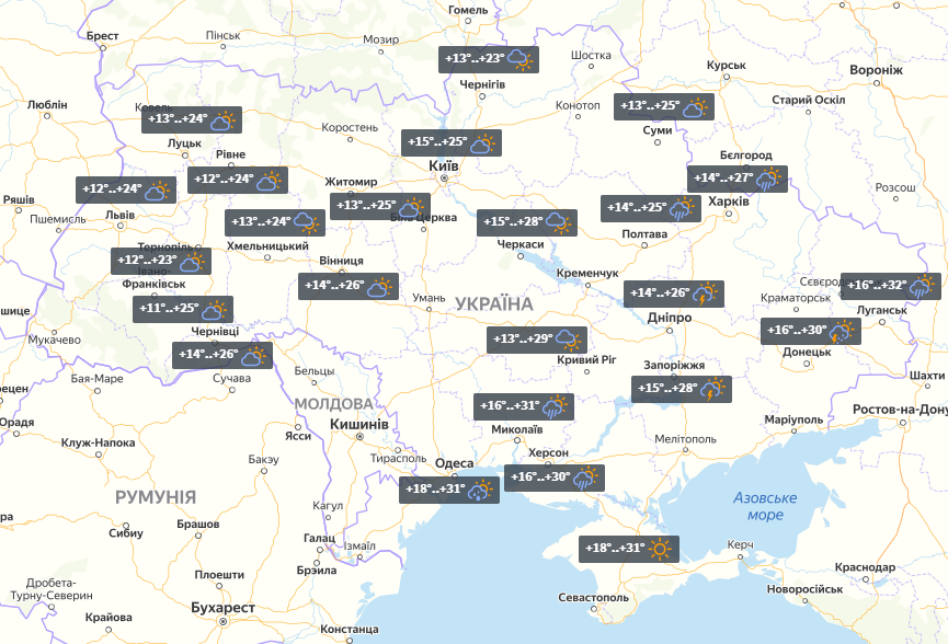 Погода в Україні 31 липня буде мінливою. На сході пройдуть дощі, температура вночі до +14°, вдень до +32°. Жителів південних регіонів також очікують опади. Вночі температура до +16°, вдень до +31°.