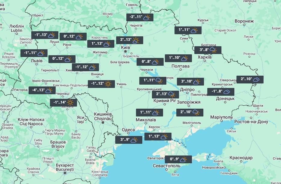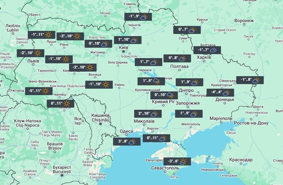 У вівторок, 18 березня, в Україні стане ще холодніше. По всій країні стовпчики термометрів покажуть +1°...+5°, а вночі очікуються морози до -6°. Опади змістяться на лівобережжя країни.