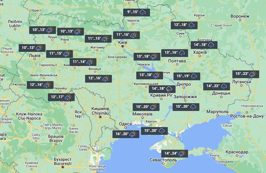Жителів центральних областей чекає температура в межах +16°...+19°. Дощі місцями будуть сильними та з грозами.