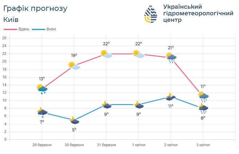 Температура вночі найближчим часом буде коливатися в межах +5°...+11°, в денні години температурні показники можуть досягати +20°...+22°, але з середини наступного тижня температура поступово знижуватиметься. Зокрема, вже 3 квітня очікується різке похолодання - температура у столиці впаде одразу на 10 градусів, до +11° вдень.