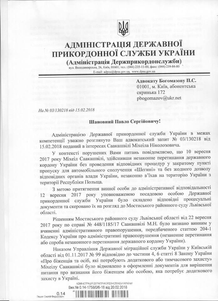 Про це на своїй сторінці у Facebook повідомив сам Саакашвілі, опублікувавши відповідь першого заступника глави Держприкордонслужби Василя Серватюка на запит адвокатів.