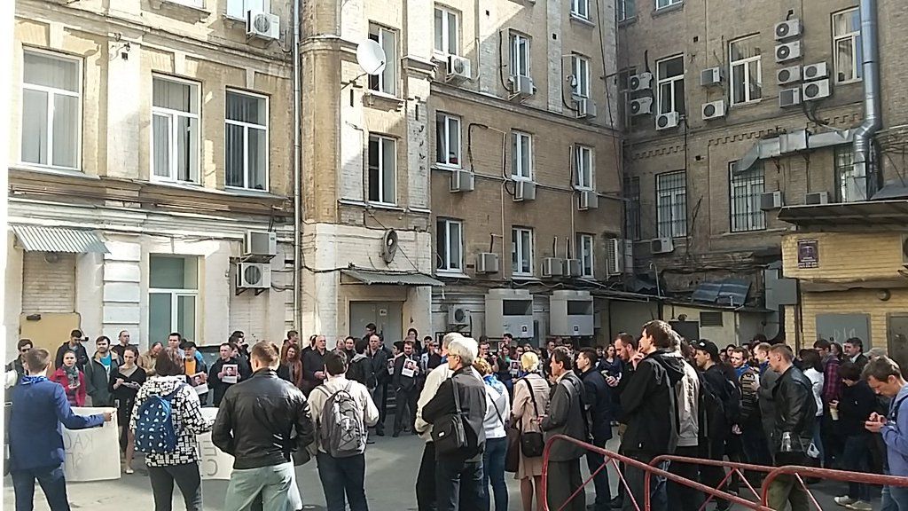 На вулиці біля будівлі Печерського райсуду (на Хрещатику) проходить мітинг на підтримку Каська. Його учасники з мегафона закликають: "Руки геть від Каська!".