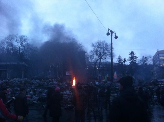 Над вулицею Грушевського на підходах до будівлі уряду знову піднімаються клуби чорного диму. В районі барикад видно полум'я. Пострілів і розривів гранат поки не чути.