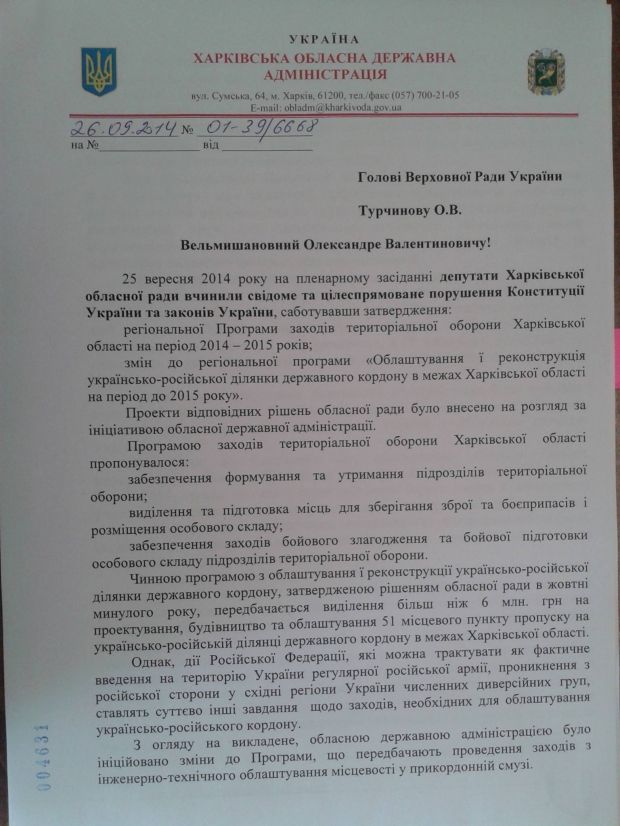 "У зв'язку з саботажем прийняття Програм, спрямованих на підвищення обороноздатності регіону та захист громадян від можливої агресії, мною направляється подання на адресу Голови Верховної Ради про необхідність дострокового припинення повноважень Харківської обласної ради", - написав він.