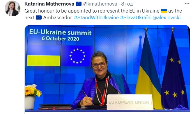 19 квітня стало відомо, що новим послом Євросоюзу в Україні мають призначити заступницю генерального директора Європейської комісії з питань розширення Катаріну Матернову. На цю посаду вона може заступити в вересні 2023 року.