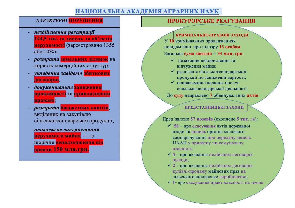За результатами аудиту, заявила Венедіктова, до Державного земельного кадастру внесені відомості лише про 320 тис. га - 69% із 465 тис. га землі, які перебували в постійному користуванні Національної академії аграрних наук України.