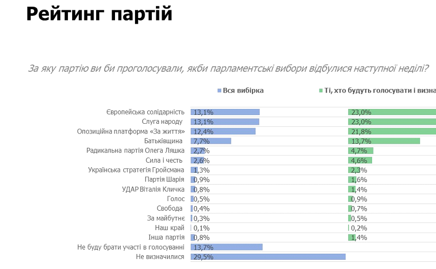 Якби наступної неділі відбулися вибори до Верховної Ради, то на них найбільшу кількість голосів з мінімальним відривом отримали б три партії: "Європейська солідарність" та "Слуга народу" з однаковими показниками (за них би проголосували 13,1% серед всього населення та 23% від тих, хто визначився з партією), а також ОПЗЖ (12,4% та 21,8%, відповідно).