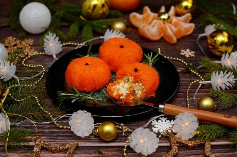 Зовнішній помаранчевий шар робиться з вареної моркви, а всередині - суміш сиру і курки. Можна також приготувати вегетаріанський варіант із крабовими паличками.