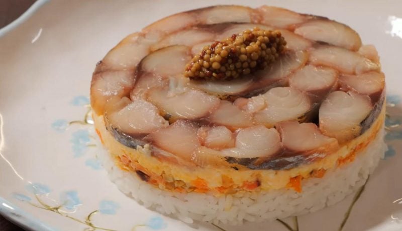На велику плоску тарілку поставити кондитерське кільце або роз'ємну форму для запікання, викласти першим шаром рис, потім овочеву масу, потім яйця. Зверху розмістити в'ялені томати, злегка утрамбувати. Наприкінці викласти шматочки скумбрії, прикрасити гірчицею в зернах або ікрою.