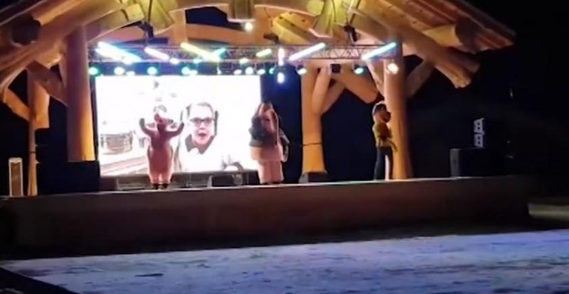 У російському Красноярську аніматори в костюмах слона, свині і собаки вечорами танцюють на сцені під музику перед абсолютно порожній майданчиком.