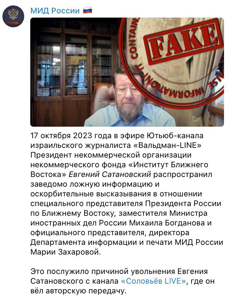 "Це спричинило звільнення Євгена Сатановського з каналу "Соловйов LIVE", де він вів авторську передачу", - зазначили в МЗС РФ.