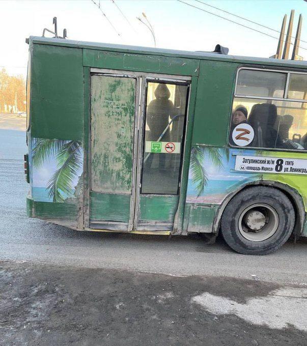 "Гнилий обриганий тролейбус з фанерними дверима і новомодною свастикою Z на склі. Скільки нових тролейбусів можна було купити на гроші, витрачені на каральну операцію? Але про таке в РФ просто не замислюються. Для них краще самим жити в гівні і не давати жити іншим...", - пише журналіст.