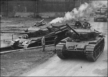 Далі розташувалися основний німецький танк Другої світової MK-IV, сучасний англійський Челленджер, радянський Т-54/55, ізраїльський Меркава і американський М-4 Шерман часів Другої світової війни.