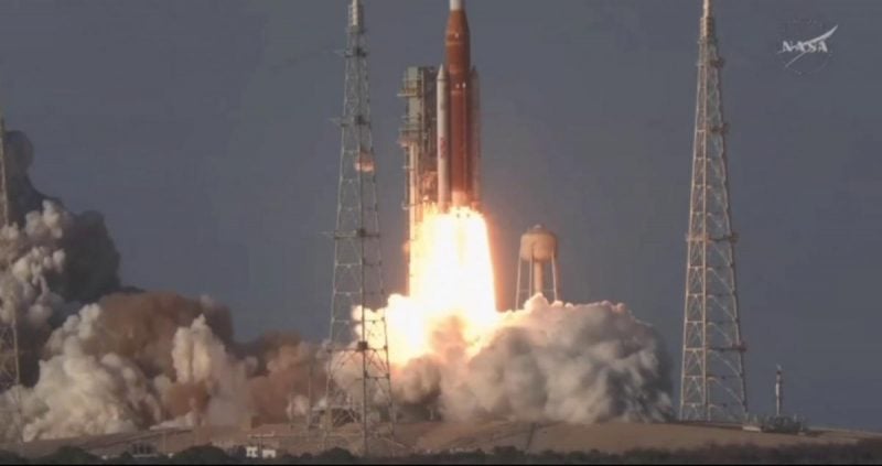 Ракета Space Launch System, висота якої перевищує висоту Статуї Свободи, розвинула швидкість близько 17 500 миль на годину (28 100 км/год), прямуючи в космос. Під час підйому вона залишала за собою вогняний і димний слід, а потім скинула відпрацьовані бічні прискорювачі, що забезпечували додаткову тягу.