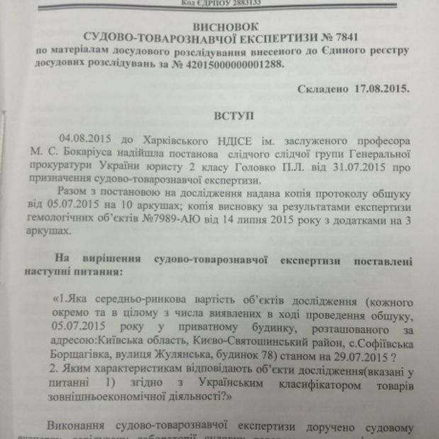 "Загальна ринкова вартість діамантів (без врахування ПДВ), зазначених у постанові про призначення експертизи, станом на 29 липня 2015 року складала 535 733,52 грн", - йдеться у документі.