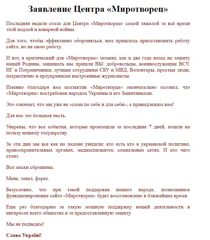 13 травня центр "Миротворець" заявив про закриття свого сайту.