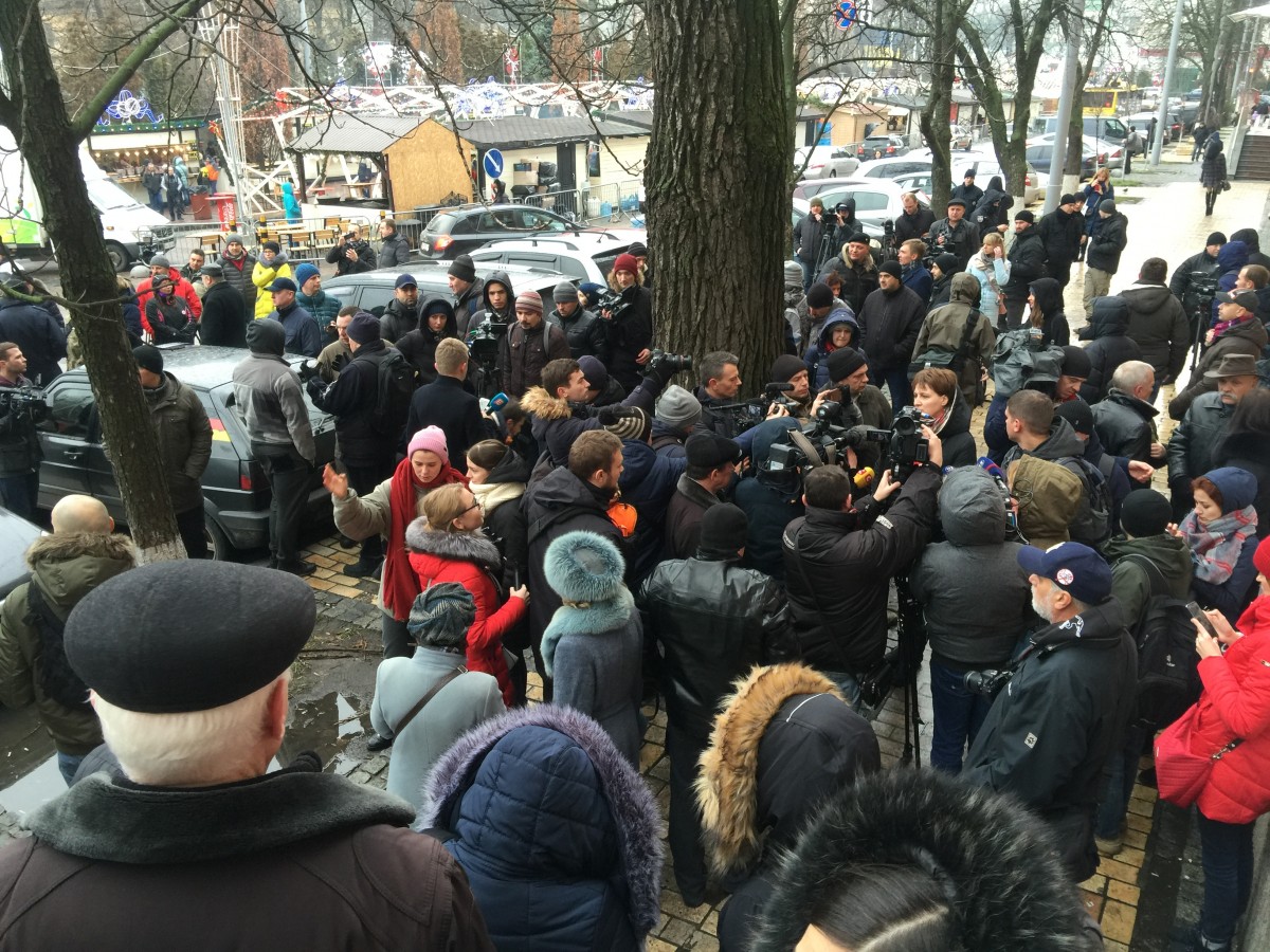 Люди тримають в руках плакати з написами "Винесіть вирок собі". Вони викрикують "Ганьба!" і погрожують зайти всередину. Принесли шини, передає "Українська правда".