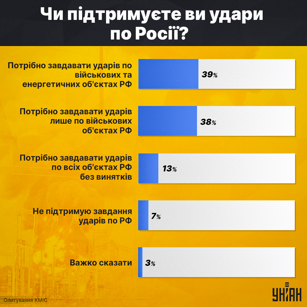 Лише 7% респондентів, як зазначається, не підтримують завдання ударів по Росії.