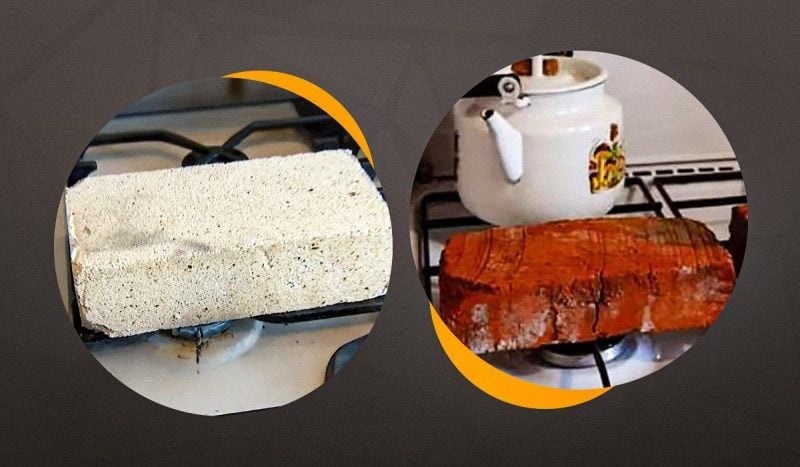 Штучні матеріали – це не тільки цегла, а також і бетон – термічно нестабільні. Вони можуть не лише давати шкідливі випари, а й просто розвалитися. Якщо ж людина сильно хоче обігріти приміщення цеглою і в неї немає каміння, яке підходить для таких цілей, то цеглу варто нагрівати на вулиці на вогнищі, але ні в якому разі не на газу.