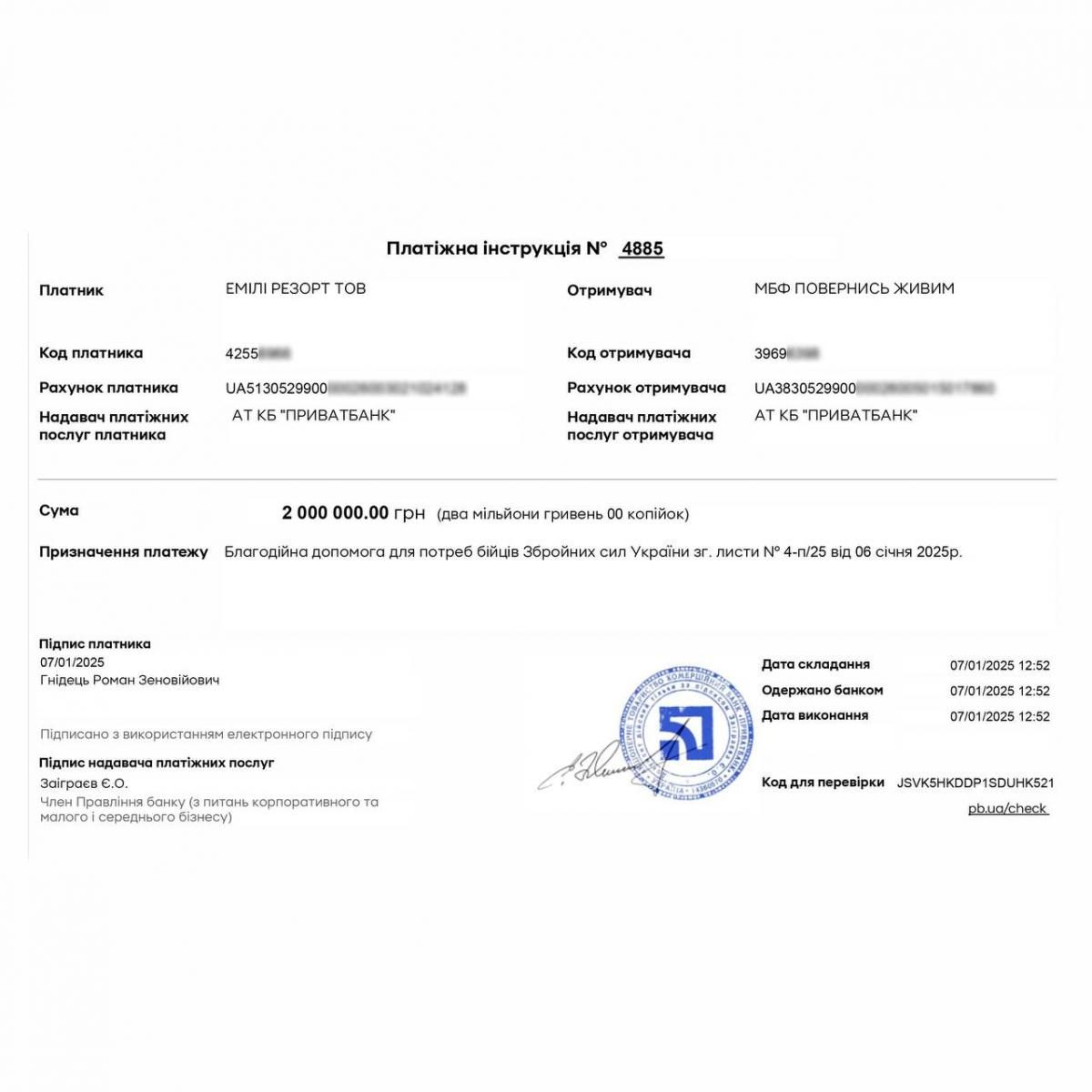 Відомий львівський меценат Григорій Козловський разом з Emily Resort передав у новому 2025 році 2 мільйони гривень на підтримку Збройних Сил України через фонд "Повернись живим". Цей благодійний внесок став результатом новорічних святкувань у гірському курорті Emily Resort, де частина прибутку направляється на допомогу військовим та медичним закладам.