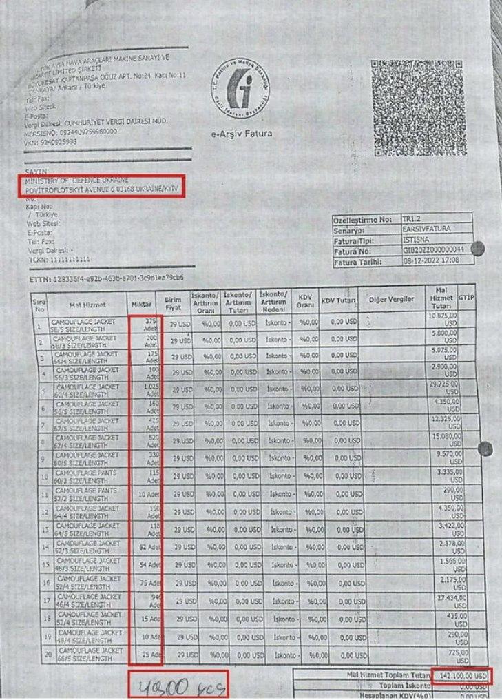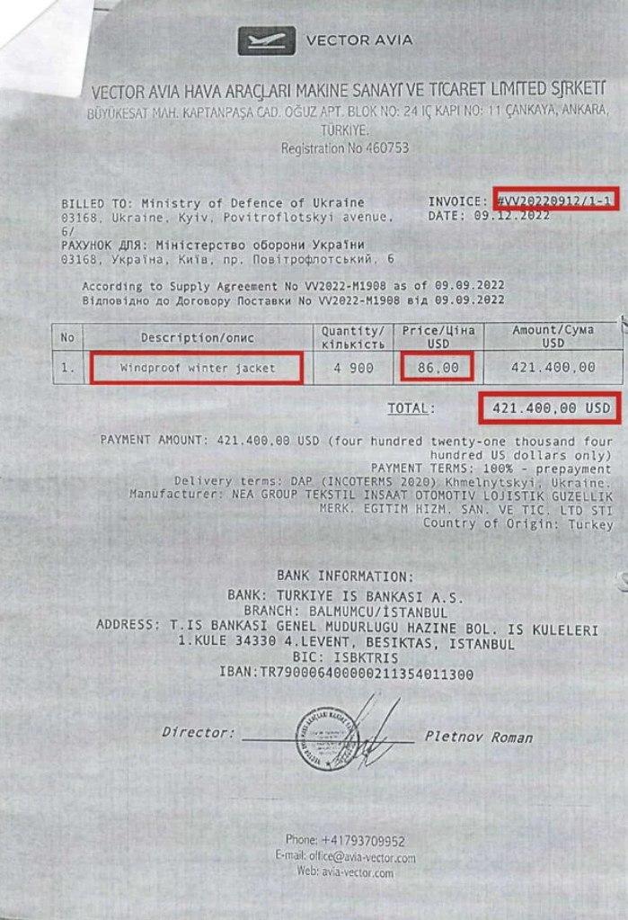 Як йдеться у розслідуванні ZN.UA, восени 2022 року Міноборони уклало контракт із турецькою фірмою "Vector avia hava araçlari" на поставку зимового одягу. За даними джерел видання, ця фірма лише у жовтні-грудні ввезла до України з Туреччини 233 тис. курток на 20 млн дол. і 202 тис. штанів на 13 млн дол.