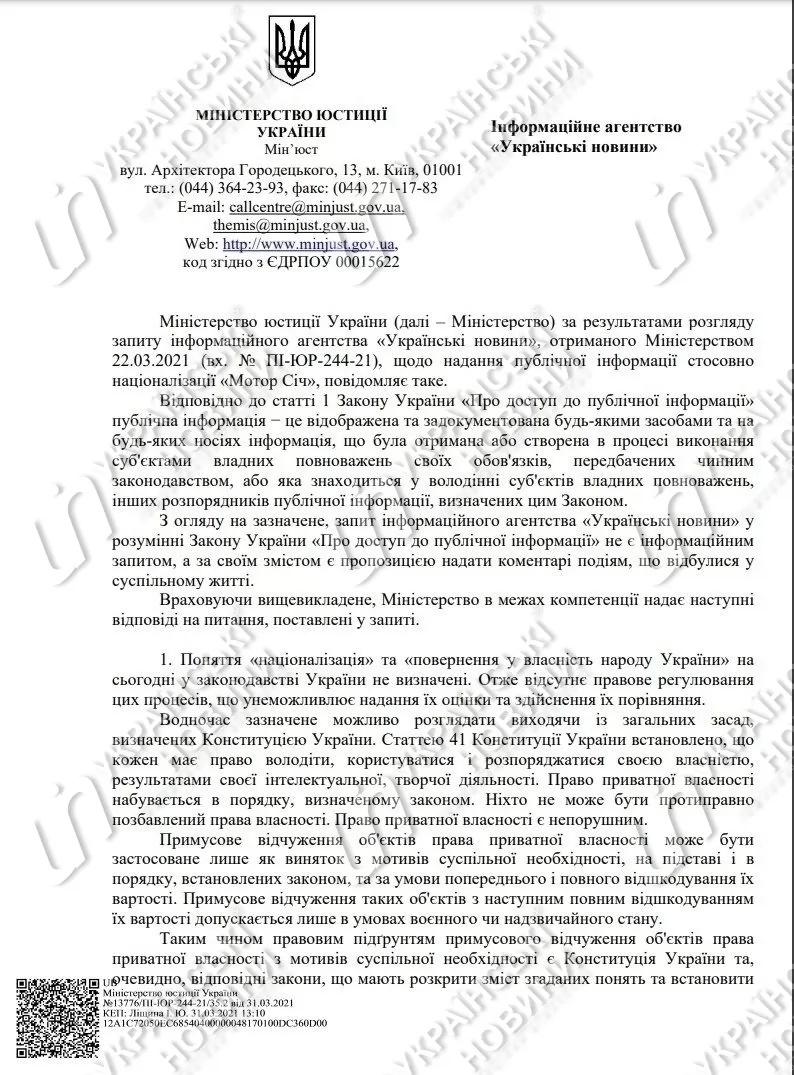 Як повідомляє Міністерство юстиції України, там не мають інформації, щодо того, чи є "Мотор Січ" стратегічним підприємством, і це питання не знаходиться в компетенції цього органу влади. Під тим же приводом було проігноровано питання про правові підстави, на яких українська влада називає підприємство стратегічно важливим і про розмір оборонного замовлення, виконаного ним в останні 5 років. А також питання про те, чи можна розробити повноцінний закон, що регулює питання націоналізації за 2-3 тижні, як це обіцявши 12 березня цього року заступник голови фракції "Слуги народу" Олександр Корнієнко.