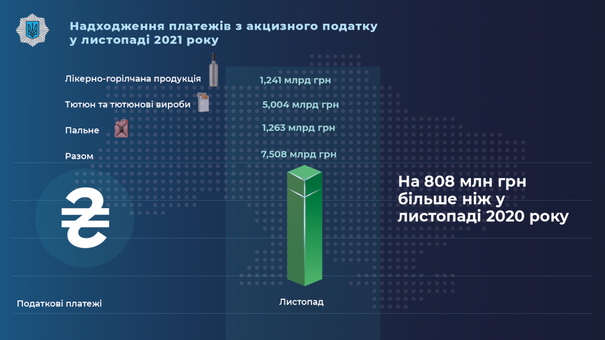 Зокрема, в листопаді цього року надходження платежів з акцизного податку на вироблені в Україні товари становило 7,508 млрд грн, що на 808 млн гривень більше в порівнянні з листопадом 2020 року.