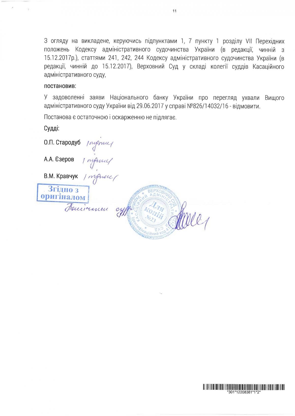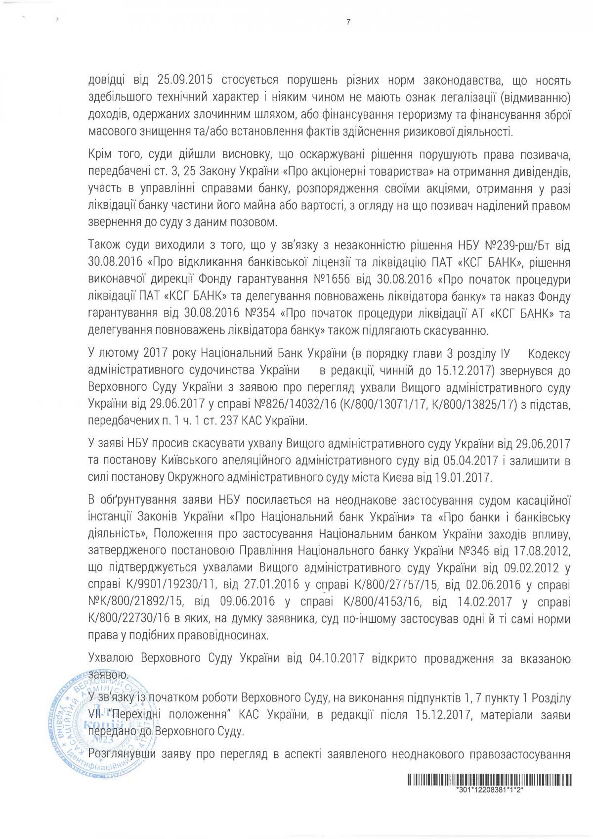 "Надалі рішення Київського апеляційного адміністративного суду було розглянуто та підтверджено Вищим адміністративним судом України та Верховним судом України. Як відомо, це кінцеві судові інстанції, рішення яких не підлягають оскарженню. Усі скарги НБУ та ФГВ цими інстанціями були відхилені, всі їхні претензії до банку визнано незаконними, а банківську ліцензію було відновлено", - зазначає він.
