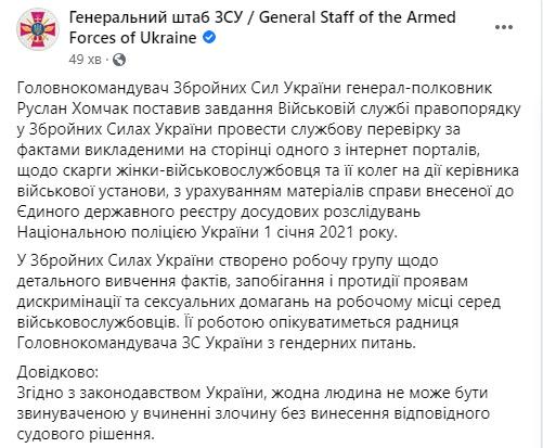 Після розголосу цієї історії в ЗМІ Головнокомандувач ЗСУ Руслан Хомчак доручив військовій службі правопорядку провести службову перевірку за фактами скарги жінки-військовослужбовця.