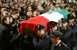 Раніше в сіцілійському місті Катанія пройшли похорони поліцейського, який загинув, намагаючись навести порядок під час масової бійки, влаштованої футбольними фанатами.