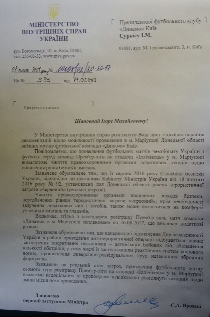 Футбольний клуб «Динамо» (Київ) у відповідь на звернення в МВС, СБУ та УДО про надання рекомендацій щодо можливості проведення у місті Маріуполі Донецької області виїзних матчів чемпіонату України серед команд Прем'єр-ліги команди «Динамо» (Київ) отримав офіційні листи від даних силових державних структур, повідомляє офіційний сайт ФК "Динамо" (Київ).