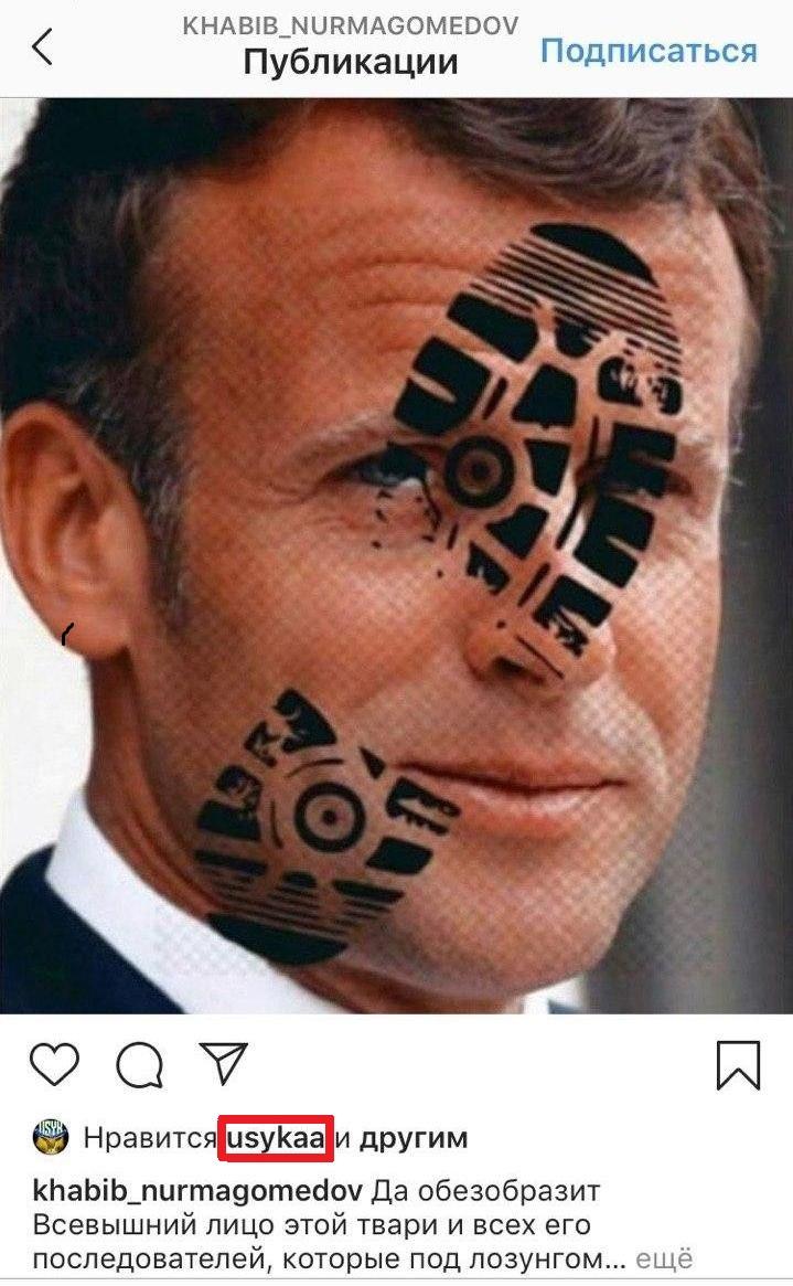 Нурмагомедов розмістив фото Макрона зі слідом підошви на обличчі. Також росіянин відреагував на слова французького президента, який назвав "ісламським терористичним актом" вбивство вчителя Самуея Паті. Останній показав на уроці карикатуру на пророка Мухаммеда.