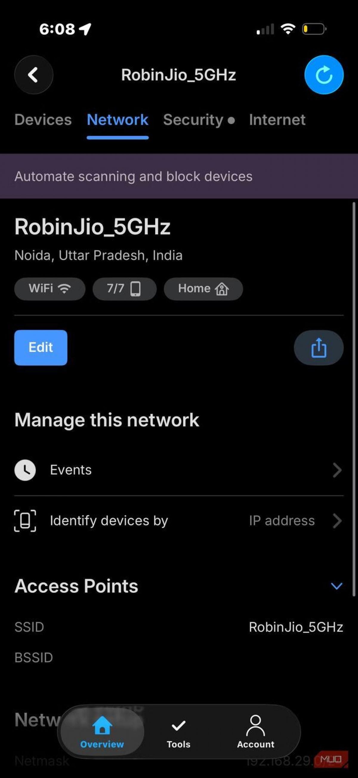 Щоб перевірити, чи підключений ще хтось до вашого Wi-Fi, встановіть Fing на свій телефон (iOS, Android) або комп'ютер (macOS, Windows). Після запуску потрібно натиснути кнопку сканування мережі.