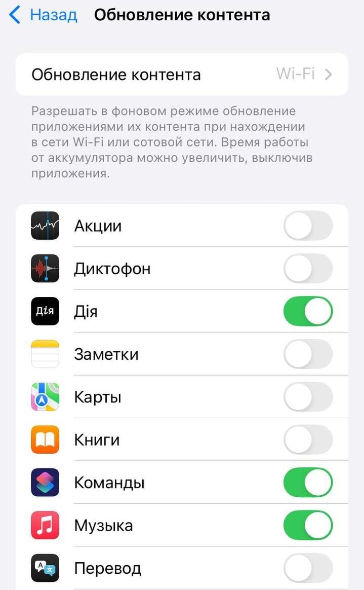 Для iOS алгоритм трохи інший: потрібно зайти в "Параметри", потім у розділ "Загальні" і вибрати пункт "Оновлення контенту". У цьому меню можна вказати, які додатки не зможуть фоново довантажувати контент.