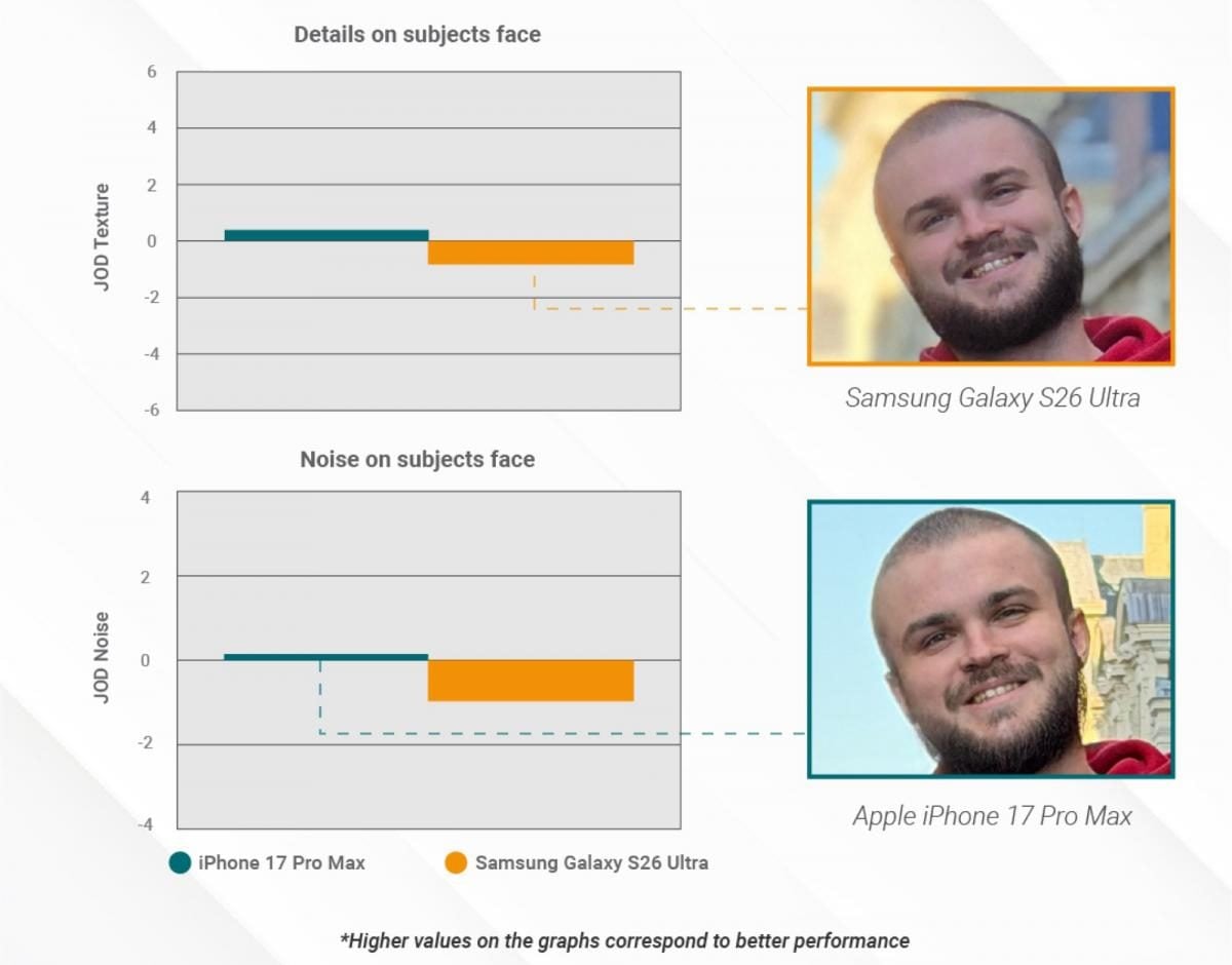 Незважаючи на це, цих поліпшень недостатньо, щоб повністю скоротити відставання від iPhone 17 Pro. У DxOMark підкреслюють, що камерофон Samsung поступається Apple в точності автофокусування під час розпізнавання облич і точності ефекту боке в деяких ситуаціях. Також iPhone 17 краще справляється з сегментацією портретів.