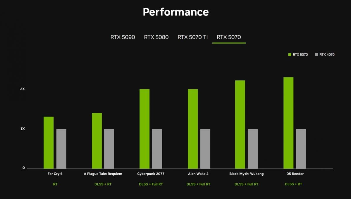 Також компанія заявляє, що продуктивність RTX 5070 за $549 буде порівнянна за продуктивністю з RTX 4090, хоча реальну міць середньобюджетної новинки варто оцінювати після реальних тестів.